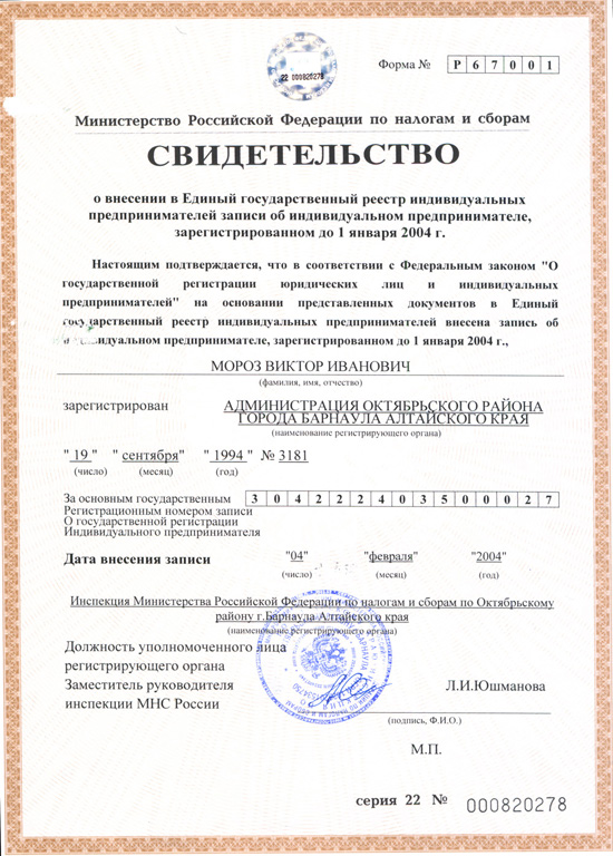 Настоящее свидетельство является основанием для осуществления индивидуальной деятельности по ремонту телерадиоаппаратуры на территории города Барнаула.